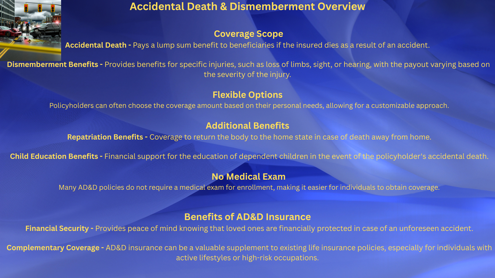 American Income Accidental Death and Dismemberment (AD&D) insurance is a type of policy offered by American Income Life Insurance Company (AIL) that provides financial protection in the event of an accidental death or serious injury.