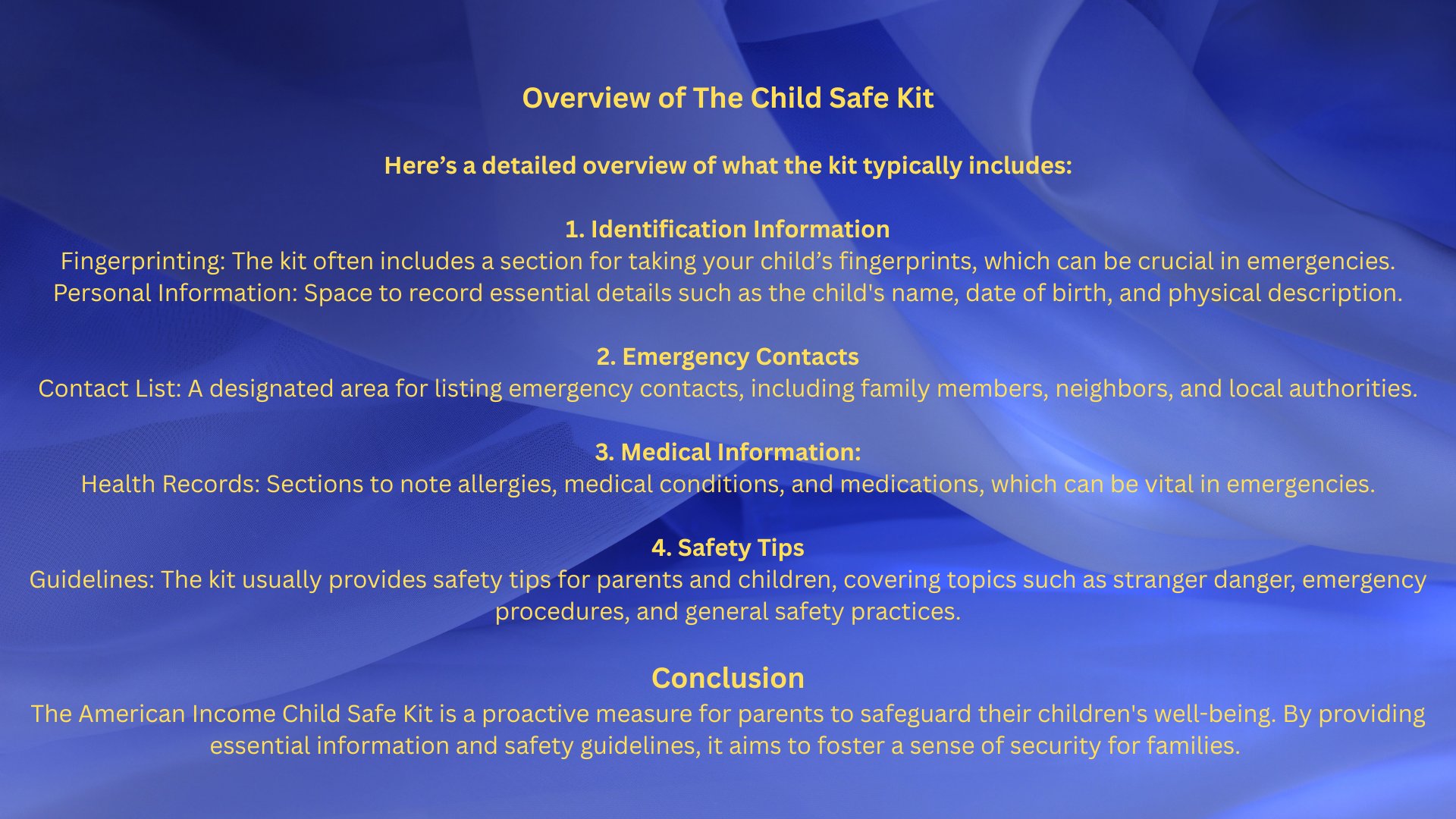 The American Income Child Safe Kit is a resource provided by American Income Life Insurance Company (AIL) designed to help parents and guardians ensure the safety and well-being of their children.